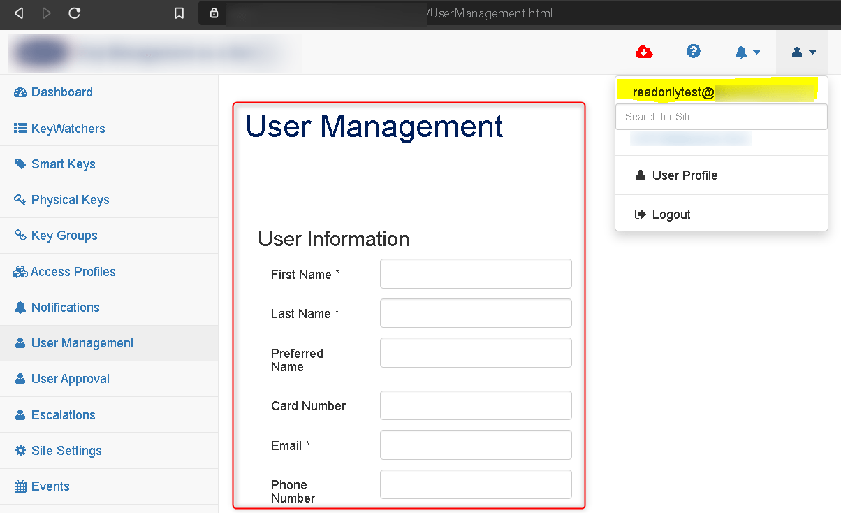 Logged in as a read-only user, we notice that, under the “User Management” menu, the “Add User” button is disabled.