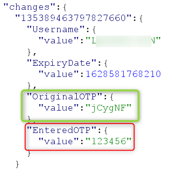 2. Enter an invalid OTP and check the server's response. Notice that, in the next requests, we receive the valid OTP (see the “OriginalOTP Value parameter” below):