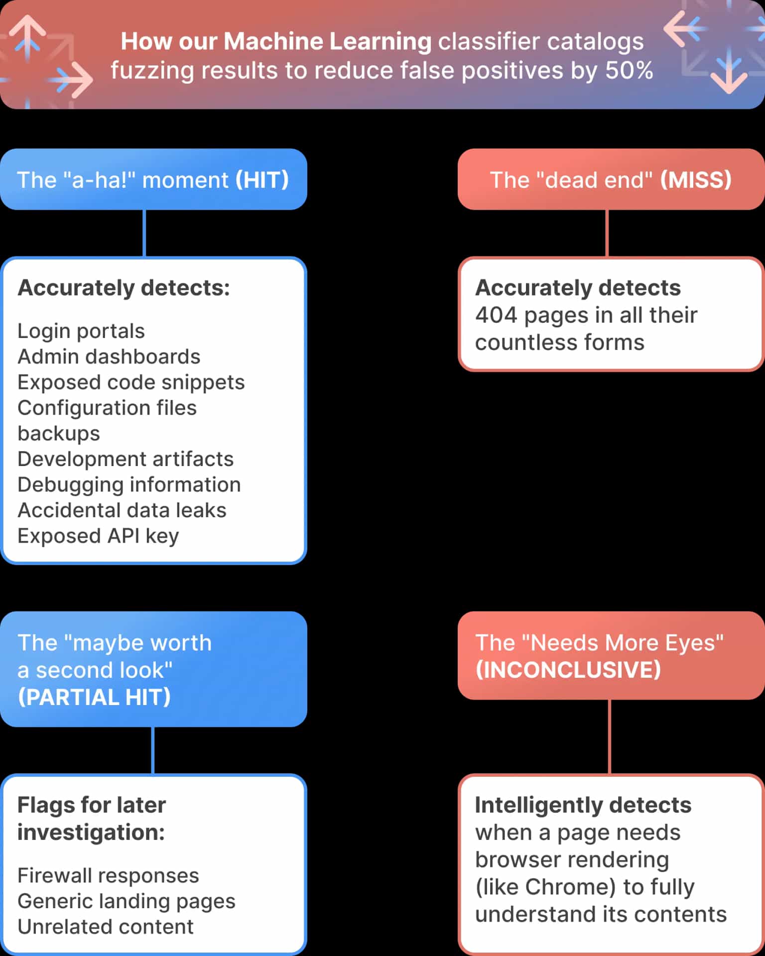 These are the tricky ones – responses that aren't immediately a hit or a miss, but could still hold clues. Think of firewall responses, generic landing pages, or unrelated content that could become relevant in a broader attack scenario. Our model flags these for potential later investigation, preventing you from completely overlooking something potentially valuable.
